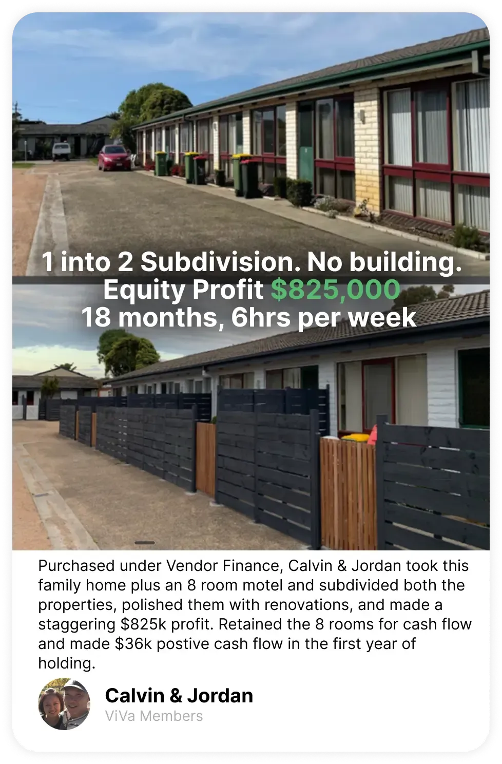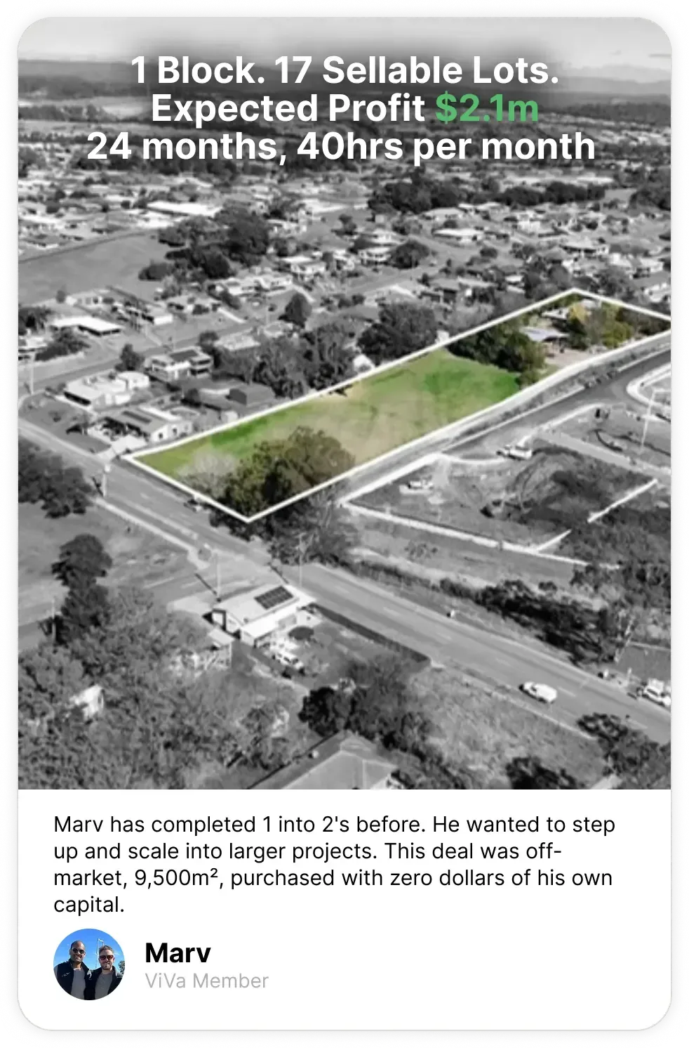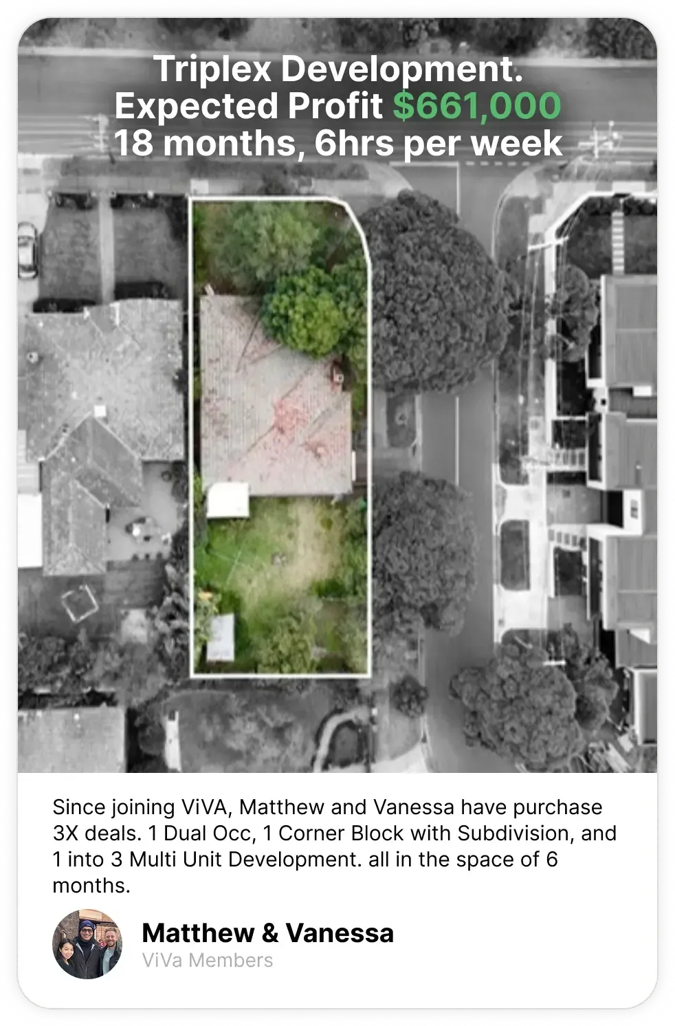 I've delivered over $170M in property development—from my first granny flat to a $70M commercial building in East Melbourne—and partnered with family offices to build a portfolio worth high eight figures. After starting businesses at 15 and working for established developers, I discovered small-scale subdivisions as the most reliable path to six and seven-figure property profits. Now through VIVA, I'm helping everyday Aussies start their own subdivision projects and build lasting wealth through real estate development.