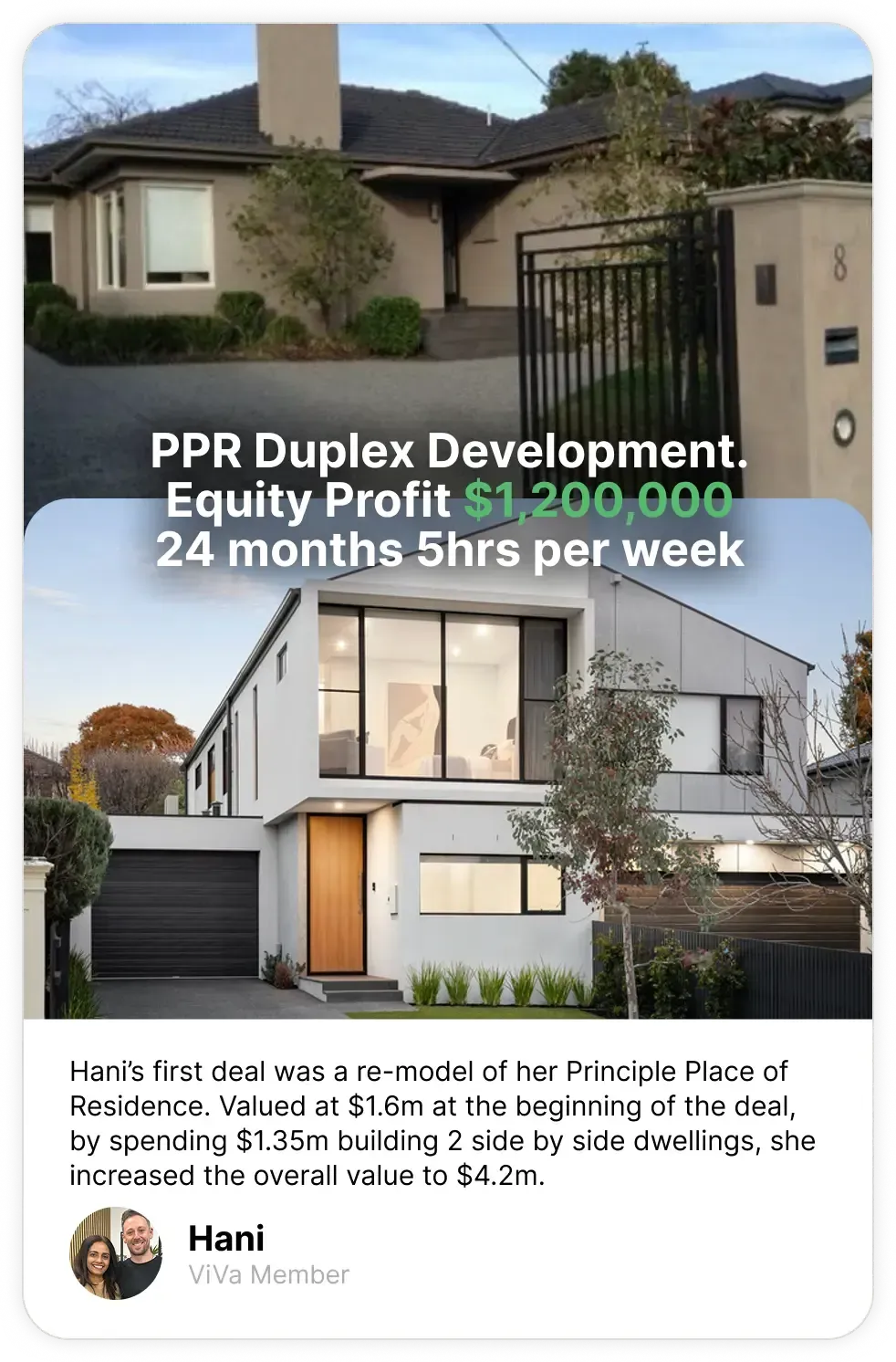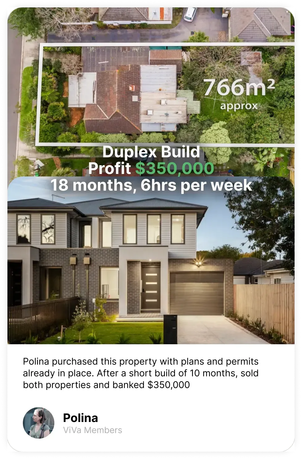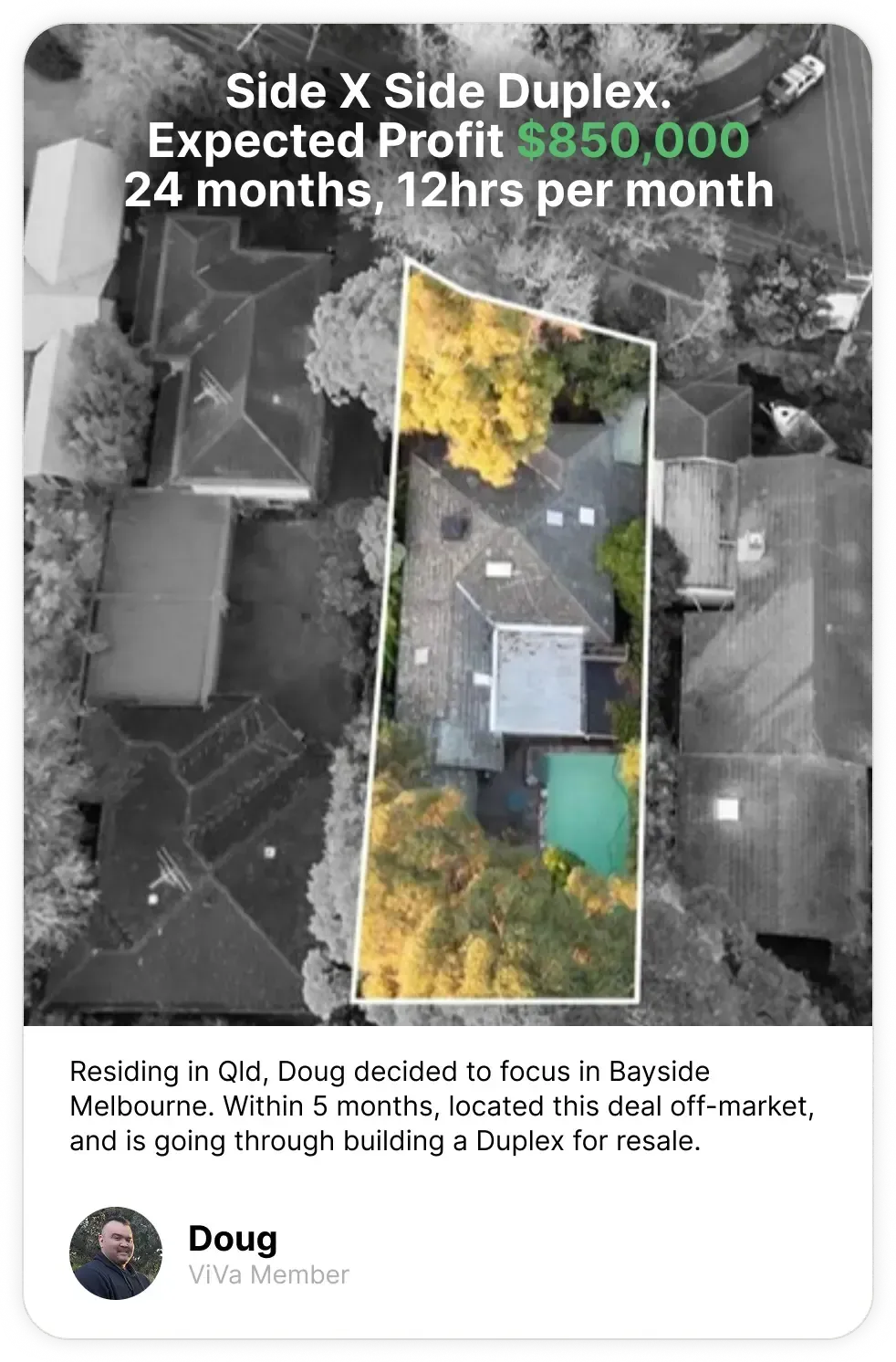 I've delivered over $170M in property development—from my first granny flat to a $70M commercial building in East Melbourne—and partnered with family offices to build a portfolio worth high eight figures. After starting businesses at 15 and working for established developers, I discovered small-scale subdivisions as the most reliable path to six and seven-figure property profits. Now through VIVA, I'm helping everyday Aussies start their own subdivision projects and build lasting wealth through real estate development.
